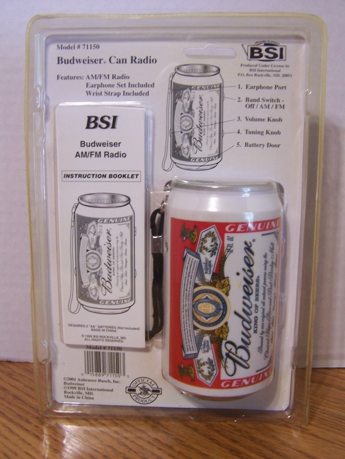"The Radio in a Can" Budweiser Can AM/FM radio from 2001 - This radio is still in the sealed blister pack although the plastic blister pack does show some discoloration/yellowing - Radio includes earphone set and wrist strap - Requires 2 "AA" batteries (not included) - Shipping in the U.S. is FREE - I accept PAYPAL