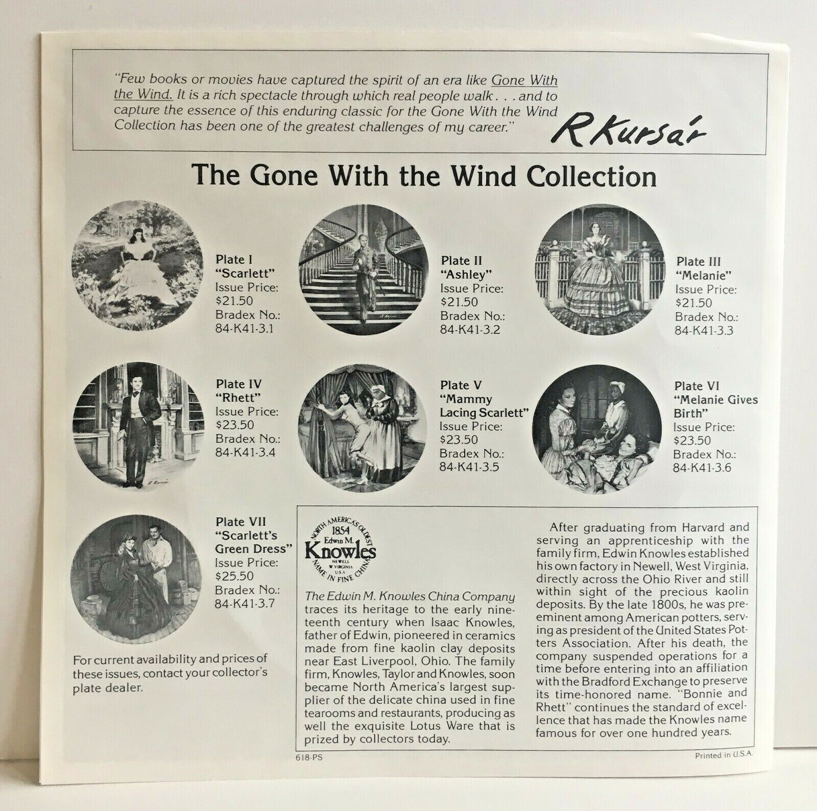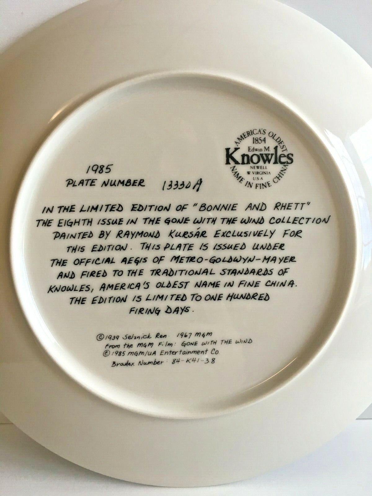 "Bonnie and Rhett" from Gone With the Wind 1985 Collector Plate 1854 Edwin M. KnowlesNewell W. Virginia, U.S.A.America's Oldest Name in Fine China Plate number: 13330ABradex number: 84-K41-3.8In hand Certificate of Authenticity. Back of plate: In the limited edition of "Bonnie and Rhett" the third issue in the Gone With the Wind collection painted by Raymond Kursar exclusively for the edition. This plate is issued under the official regis of Metro-Goldwyn-Mater and fired to the traditional standards of Knowles, America's Oldest name in fine china. The edition is limited to one hundred firing days.