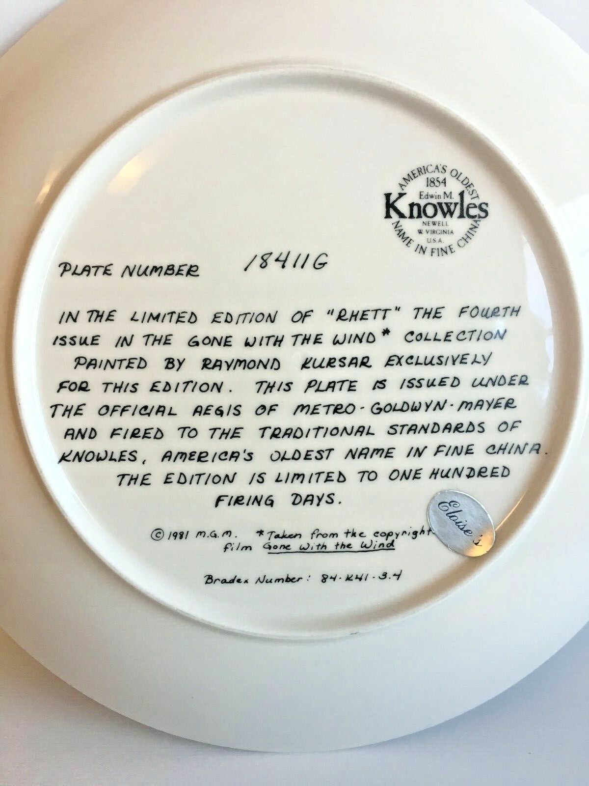 "Rhett" from Gone With the Wind 1981 Collector Plate 1854 Edwin M. KnowlesNewell W. Virginia, U.S.A.America's Oldest Name in Fine China Plate number: 18411GBradex number: 84-K41-3.4In hand Certificate of Authenticity. Back of plate: In the limited edition of "Rhett" the fourth issue in the Gone With the Wind collection painted by Raymond Kursar exclusively for the edition. This plate is issued under the official regis of Metro-Goldwyn-Mater and fired to the traditional standards of Knowles, America's Oldest name in fine china. The edition is limited to one hundred firing days.