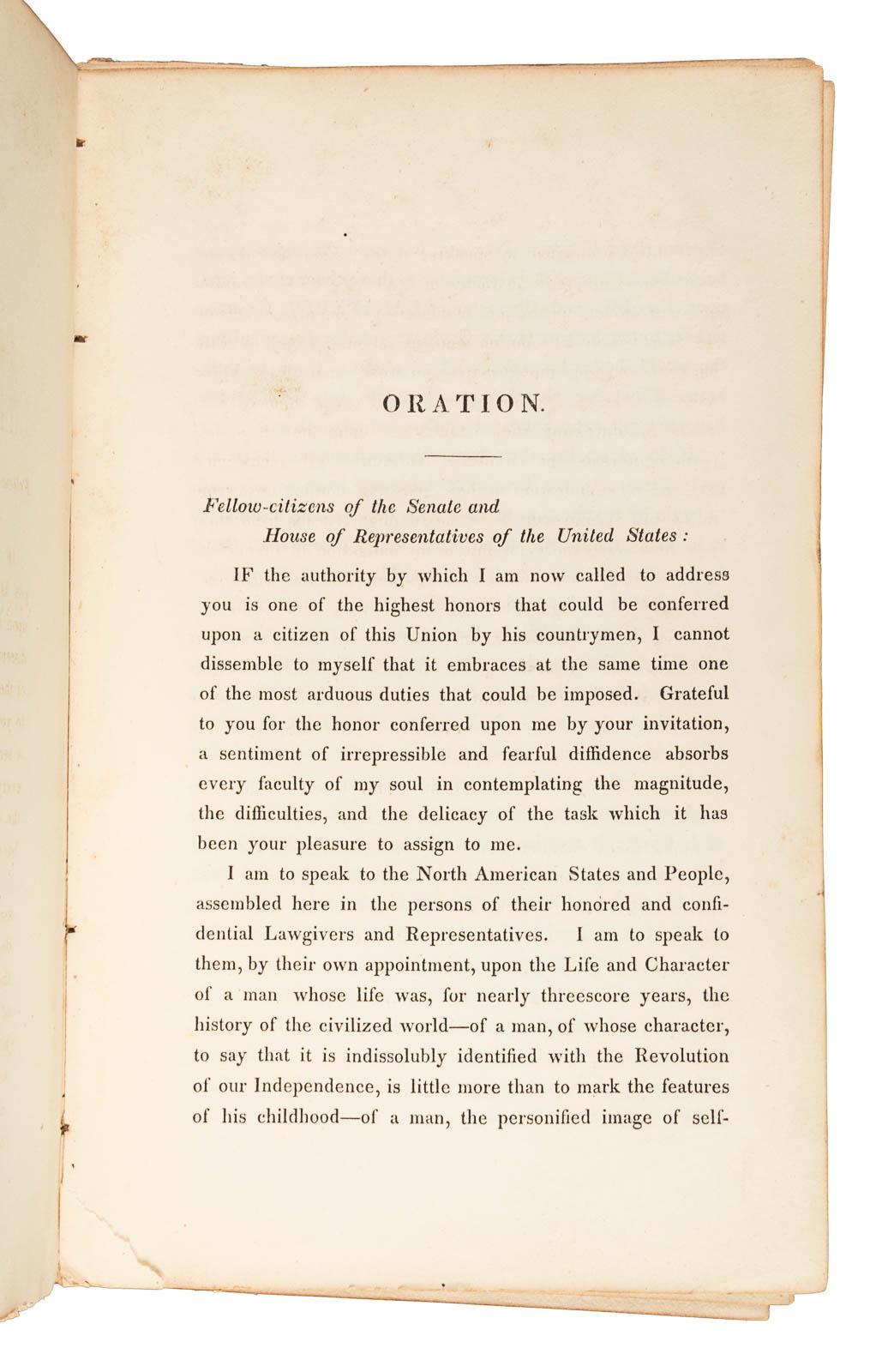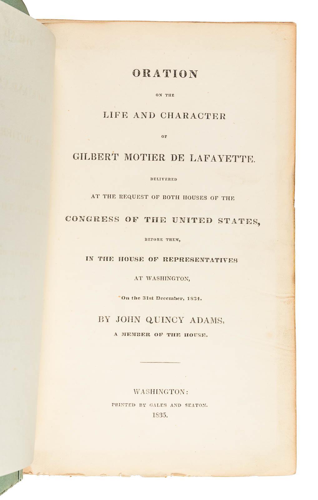 ADAMS, JOHN QUINCY. Oration on the Life and Character of Gilbert Motier de Lafayette: Delivered at the Request of Both Houses of the Congress of the United States, Before Them, in the House of Representatives at Washington, on the 31st December, 1834. Washington, DC: Gales and Seaton, 1835. First edition, 8.5” by 5.25”, 94 pages, early full black morocco, spine gilt, edges yellow, and in good condition with the binding worn, spine perishing, and contents detached and disbound (can easily be restored with binding restoration). PRESENTATION COPY OF AN ORATION ON THE LIFE AND CHARACTER OF GILBERT MOTIER DE LAFAYETTE INSCRIBED AND SIGNED BY JOHN QUINCY ADAMS TO A JACKSONIAN WHO ASSISTED IN HIS DEFEAT IN THE 1828 PRESIDENTIAL ELECTION A presentation copy inscribed and signed by John Quincy Adams to Isaac Hill: “Isaac Hill, from, John Quincy Adams.” Hill (1789–1851) was an American politician and newspaper editor who served as a United States Senator and as Governor of New Hampshire. He was a strong supporter of Andrew Jackson in the 1828 presidential election who ultimately defeated Adams and he was one of Jackson’s greatest allies in the Congress helping him pass many of his policies. Adams’ presentation inscription is on a leaf inserted at the front which is typical for inscribed copies of this work. Conventional wisdom holds that Adams was out of the country when the book was originally published so he provided pre-inscribed slips to his friends to be inserted. ADAMS DELIVERED THIS GREAT ORATION TO CONGRESS TO EULOGIZE AND COMMEMORATE MARQUIS DE LAFAYETTE’S CONTRIBUTION TO AMERICAN INDEPENDENCE The former President of the United States and Harvard professor of rhetoric delivered this great oration to Congress on December 31, 1834 to eulogize Lafayette who died on May 20, 1834 and commemorate his important contribution to American independence and his activities in the years after the conclusion of the Revolutionary War, especially his involvement in