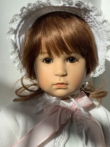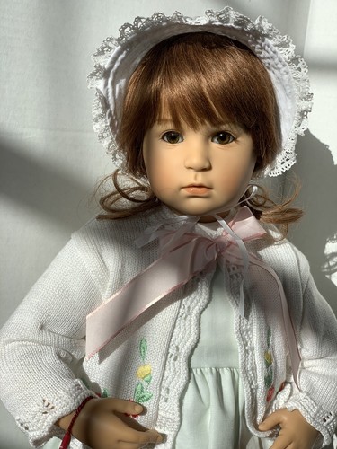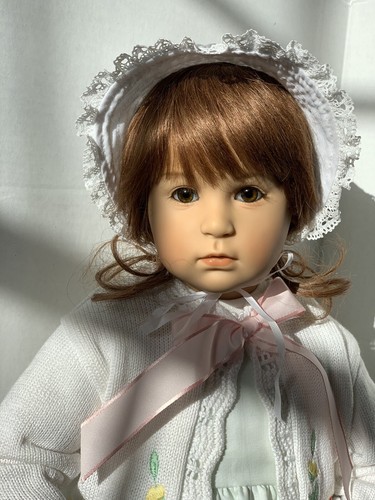 Just like new condition, Tone, is an artist doll created by Sissel Skille 2002, when Gotz dolls were still made in Germany! When Sissel created this doll she was inspired by a picture from a family album. The little girl's name is TONE, and she was two years old when the picture was taken sometime in the forties . Tone is 25" in height. She has brown hair and brown eyes. She is wearing a beautiful mint green dress and a white sweater embroidered with pink, green and yellow. She is wearing a white bonnet trimmed with lace. Her tights are white and shoes are cream color. She comes from a smoke free home and has been kept in a glass curio. She as her COA but not box. I have described her the best I can - if you have any questions please ask before bidding