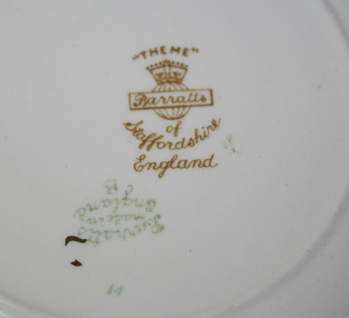 "THEME" 7 7/8" SANDWICH PLATE BARRATTS - STAFFORDSHIRE ENGLAND B #14 RARE "THEME" 7 7/8" SANDWICH PLATE BARRATTS STAFFORDSHIRE ENGLAND B #14 RARE -------------------------------- "THEME" 7 7/8 INCHPLATE BARRATTSOF STAFFORDSHIRE SALAD PLATE FLORAL PATTERN GOLD GILDED EDGE B # 14 --------------------- Good morning, today we have a Pretty "THEME" 7 7/8 inch Plate by BARRATTS of Staffordshire , up for auction. ENGLAND This Pretty Salad Plate measures 7 7/8 inches in Diameter and measures 1/2 inches in Height. "THEME" Pattern. Plate with a lot of Gold Gilding. The Plate is Marked: "STAFFORD", STAFFORDSHIRE, ENGLAND. Also Marked B 14. This Salad Plate is in Very Good Used Condition, with no nick chips or cracks. Please Look at the Pictures. As you can probably tell from the quality of my pictures, I do not make my living as a professional photographer. This Plate is much nicer than the pictures dictate - you will not be disappointed. This items is considered a "HARD FIND" and rarely appears on Ebay - do not hesitate about purchasing this Plate, you may never find another set in this condition. Shipping for this item is $9.95 for all areas on North American except Canada. which is $20.50. We have several other items for sale at this time. We combine shipping. THIS"THEME"SALAD PLATEWILL BE A GREAT ADDITION TO YOUR COLLECTION We are located in Canada and delivery may take longer than if it was mailed from a US address, delivery is usually 7 to 10 business days Listing and template services provided by inkFrog