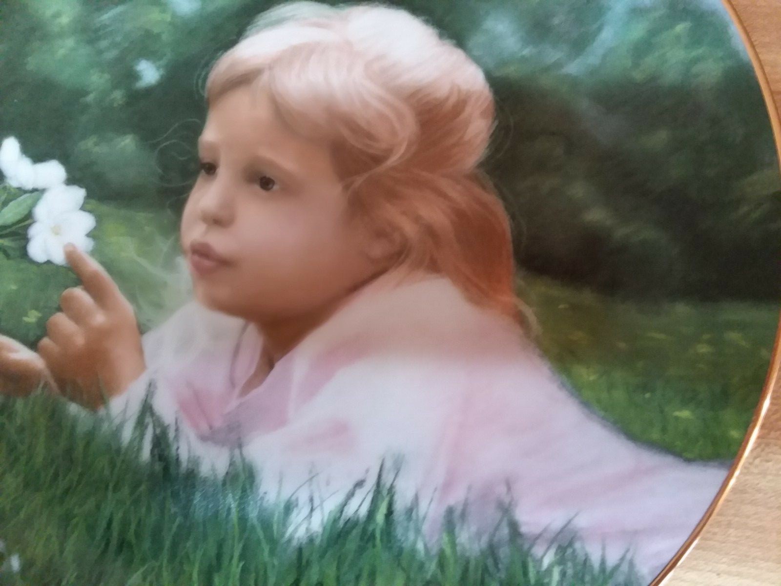 Preowned pristine condition collector plate "Apple Blossom Time" by artist Robert Anderson and offered by Pemberton & Oakes 1987. This was the fourth and final issue in the Little Girls collection. This is plate #402 in a limited edition fired for the year 1987 not to exceed 15,000 . Plate edge is gold trimmed. Plate measures approximately 8 1/4" and comes nestled in its original shipping box. Please review photos and description and contact me with questions before purchasing.