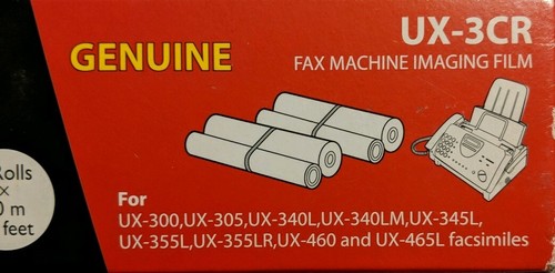 "Genuine" Sharp UX-3CR Thermal Transfer Ribbon for Fax Machine. This is a "Open Box" item....BUT, Both rolls are Unopened, still sealed in plastic wrap. Each roll is 98 feet long, as pictured this offer comes with (2) rolls...Fits: UX-300, UX-305, UX-340L, UX-340LM, UX-345L, UX-355L, UX-355LR, UX-460 and UX-465L facsimiles....Item Ships First Class with Tracking Number....Any Questions??? Just Ask...Thank you for looking and Have a Great Day ~